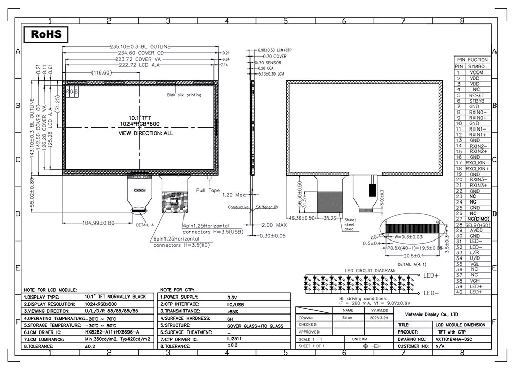 விக்ட்ரோனிக்ஸ் ஒரு தொழில்முறை டிஎஃப்டி தொகுதி உற்பத்தியாளர் மற்றும் சீனாவை தளமாகக் கொண்ட சப்ளையர். இந்த துறையில் 18 வருட அனுபவத்துடன், நாங்கள் பலவிதமான மாதிரிகளை உருவாக்கியுள்ளோம். எங்கள் நிலையான தயாரிப்புகளுக்கு மேலதிகமாக, எங்கள் வாடிக்கையாளர்களின் குறிப்பிட்ட தேவைகளைப் பூர்த்தி செய்ய தனிப்பயனாக்கப்பட்ட சேவைகளையும் நாங்கள் வழங்குகிறோம். CTP உடன் இந்த 10.1 அங்குல 1024 × 600 LVDS TFT தொகுதி என்பது தொழில்துறை, மருத்துவ மற்றும் உட்பொதிக்கப்பட்ட பயன்பாடுகளுக்காக வடிவமைக்கப்பட்ட உயர்தர 10.1 அங்குல TFT காட்சி தொகுதி ஆகும். அதிக ஆப்டிகல் செயல்திறன், கொள்ளளவு தொடு செயல்பாடு மற்றும் நீட்டிக்கப்பட்ட நம்பகத்தன்மை ஆகியவற்றை இணைத்து, இது தீவிர இயக்க நிலைமைகளில் விதிவிலக்கான தெளிவு மற்றும் ஆயுள் ஆகியவற்றை வழங்குகிறது.