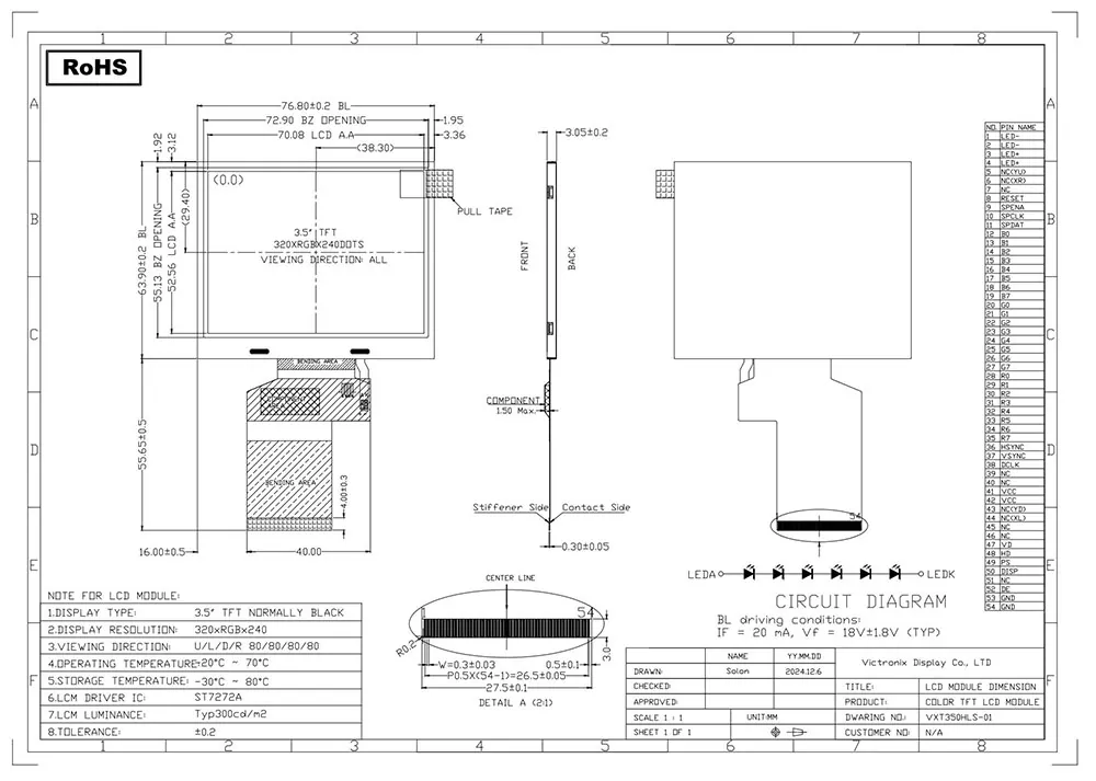 TFT LCD என்பது ஒரு வகை திரவ படிக காட்சி ஆகும், இது படத்தின் தரத்தை மேம்படுத்த மெல்லிய-திரைப்பட டிரான்சிஸ்டர் தொழில்நுட்பத்தைப் பயன்படுத்துகிறது, மேலும் இது அன்றாட வாழ்க்கையில் ஏராளமான பயன்பாடுகளைக் கொண்டுள்ளது. சீனாவில் ஒரு தொழில்முறை டிஎஃப்டி தொகுதி உற்பத்தியாளர் மற்றும் சப்ளையராக, விக்ட்ரோனிக்ஸ் 3.5 இன்ச் 320 × 240 QVGA IPS TFT தொகுதி மற்ற உற்பத்தியாளர்களிடமிருந்து வேறுபடுவது எது? முதலாவதாக, இது 300 குறுவட்டு/மீ², அனைத்து திசைகளிலும் பரந்த 80 ° பார்க்கும் கோணங்களையும், 800: 1 என்ற மாறுபட்ட விகிதத்தையும் வழங்குகிறது, இது பல்வேறு கோணங்களில் இருந்து சிறந்த வாசிப்புத்திறனை உறுதி செய்கிறது. இரண்டாவதாக, இது 6 எஸ் வெள்ளை எல்.ஈ.டிகளைப் பயன்படுத்தி ஒரு வழக்கமான வாழ்நாளில் 30,000 முதல் 50,000 மணிநேரம் (50% ஆரம்ப பிரகாசம் வரை) பயன்படுத்துகிறது, இது அனைத்து லைட்டிங் நிலைமைகளிலும் தெளிவான தெரிவுநிலையை உறுதி செய்கிறது. தவிர, இது ST7272A கட்டுப்படுத்தியுடன் RGB 24-பிட் இடைமுகத்தை ஆதரிக்கிறது. கூடுதலாக, இது வெப்ப அதிர்ச்சி (-30 ° C ↔ +80 ° C சுழற்சிகள்), ஈரப்பதம் சேமிப்பு (60 ° C/90% RH) மற்றும் இயந்திர அதிர்வு உள்ளிட்ட கடுமையான சுற்றுச்சூழல் சோதனையை கடந்து செல்கிறது, இது நீட்டிக்கப்பட்ட வெப்பநிலை வரம்பில் (-20 ° C முதல் +70 ° C வரை) தடையின்றி செயல்பட முடியும் என்பதை உறுதிசெய்கிறது.